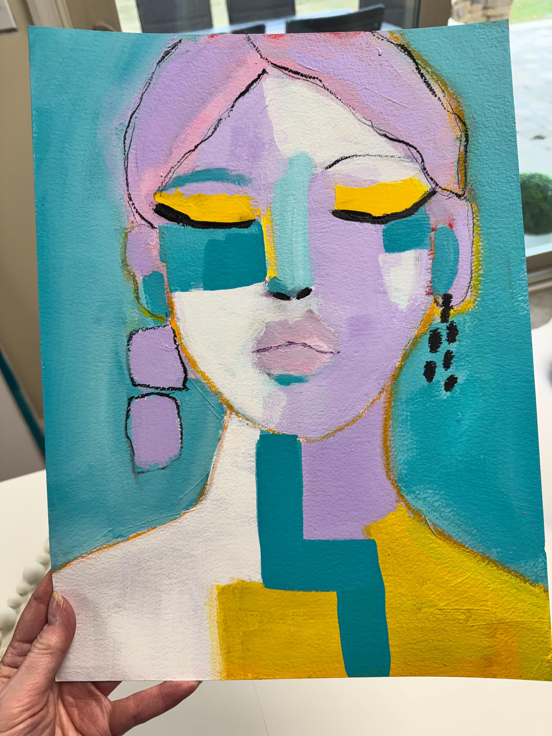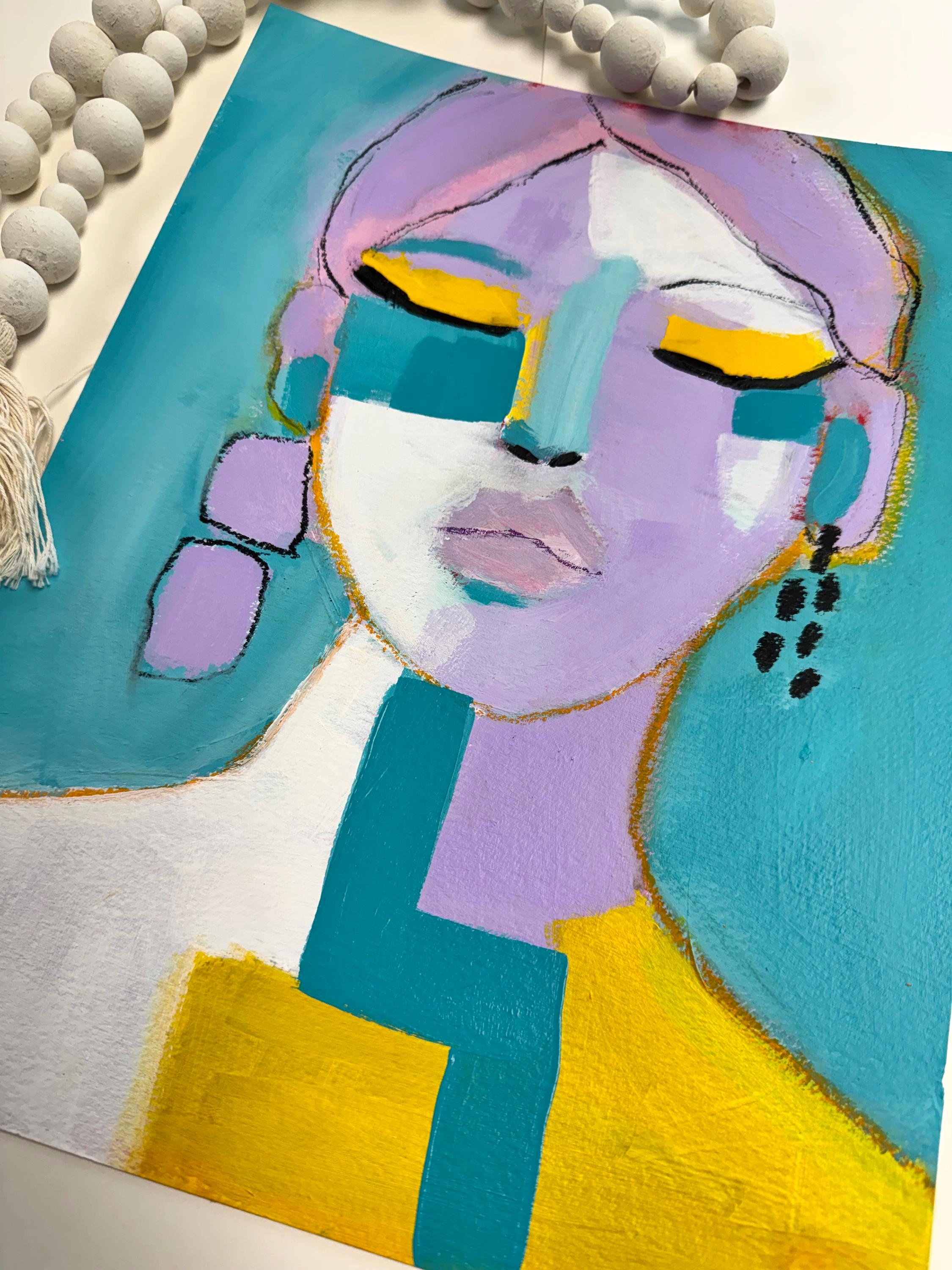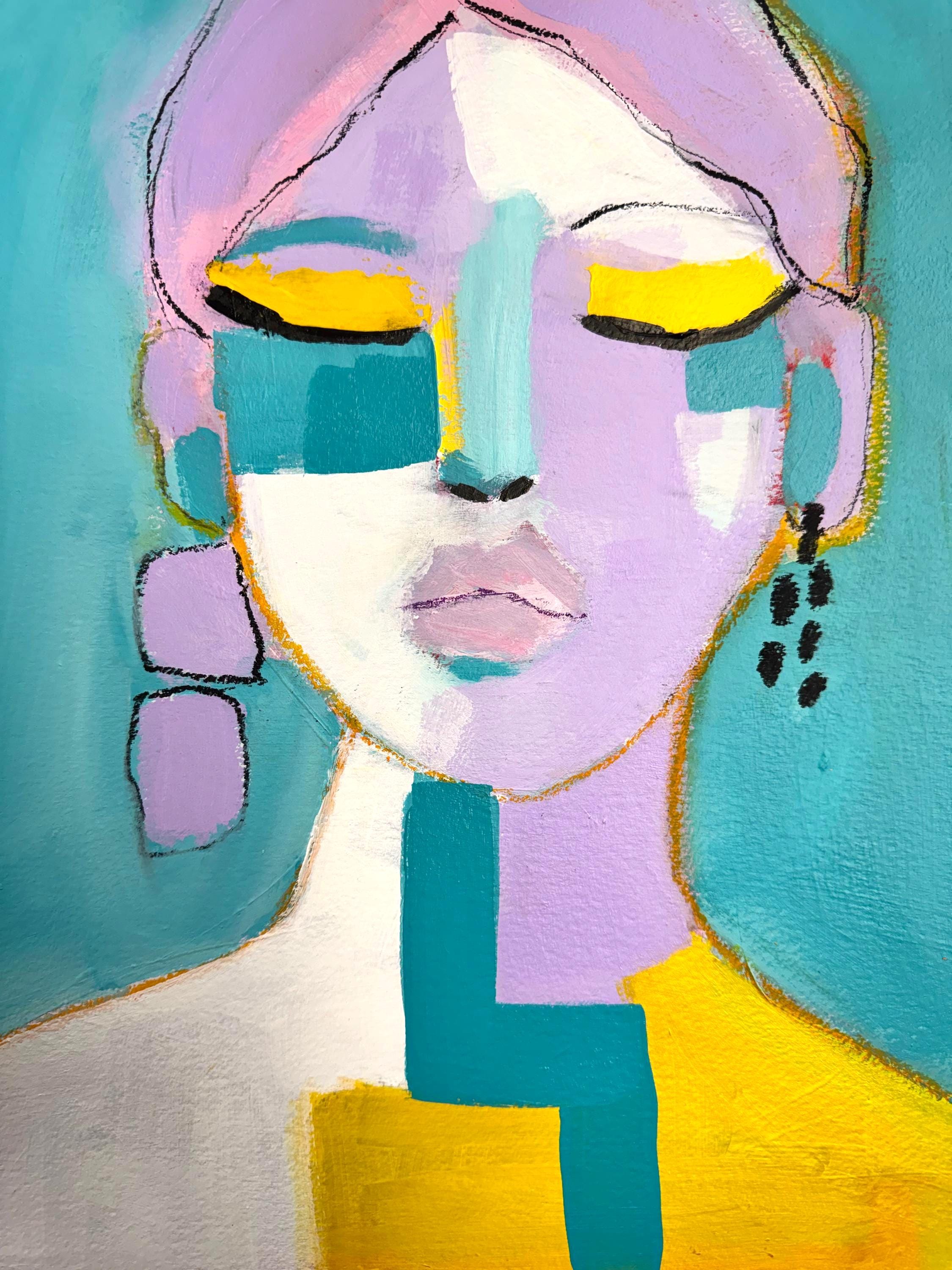 Soft lavender tones blend with turquoise, white, and vibrant golden yellow, creating a modern, expressive color palette. Loose sketch lines and layered paint give the piece movement and personality, while bold color blocking adds a contemporary edge.