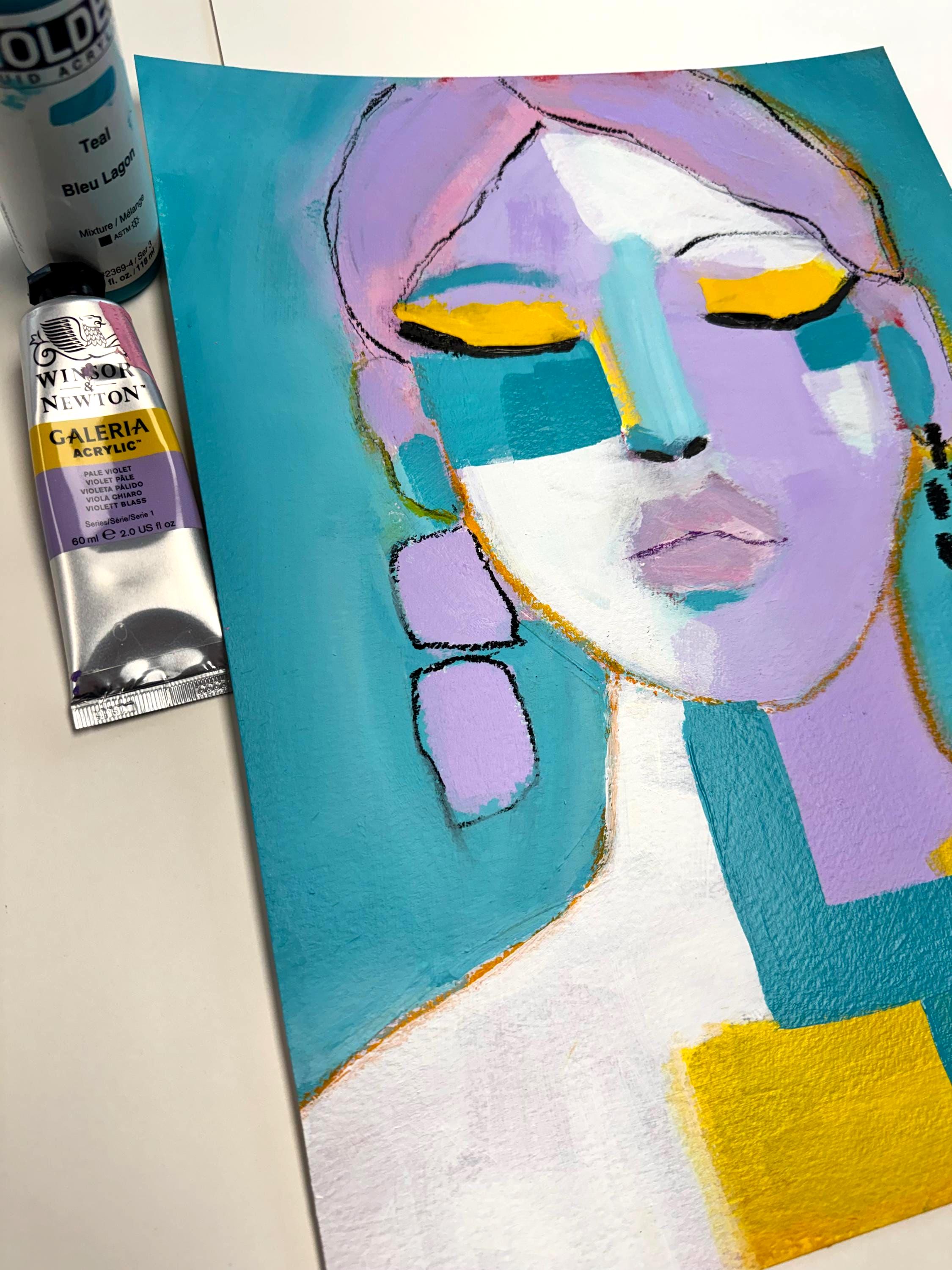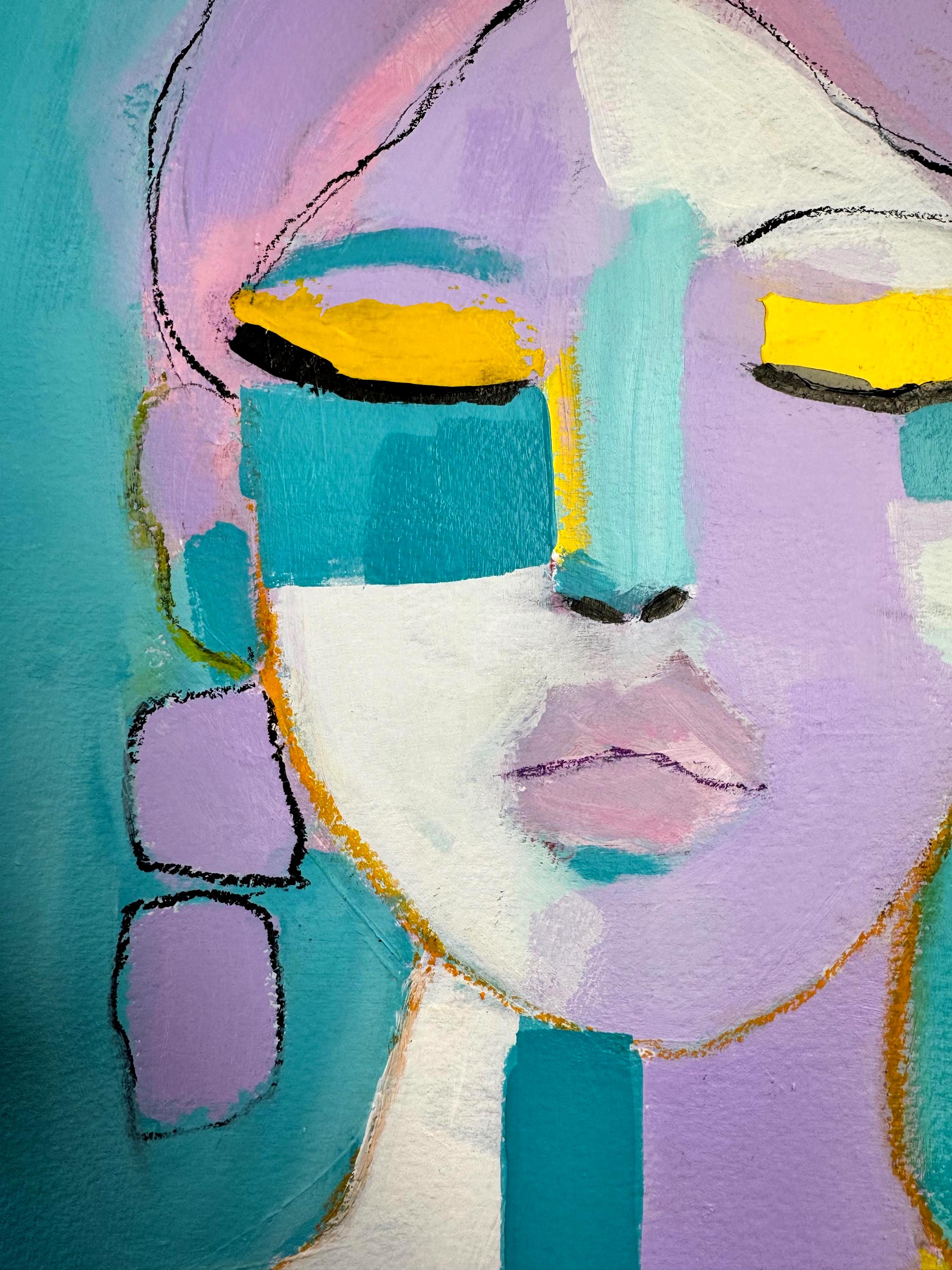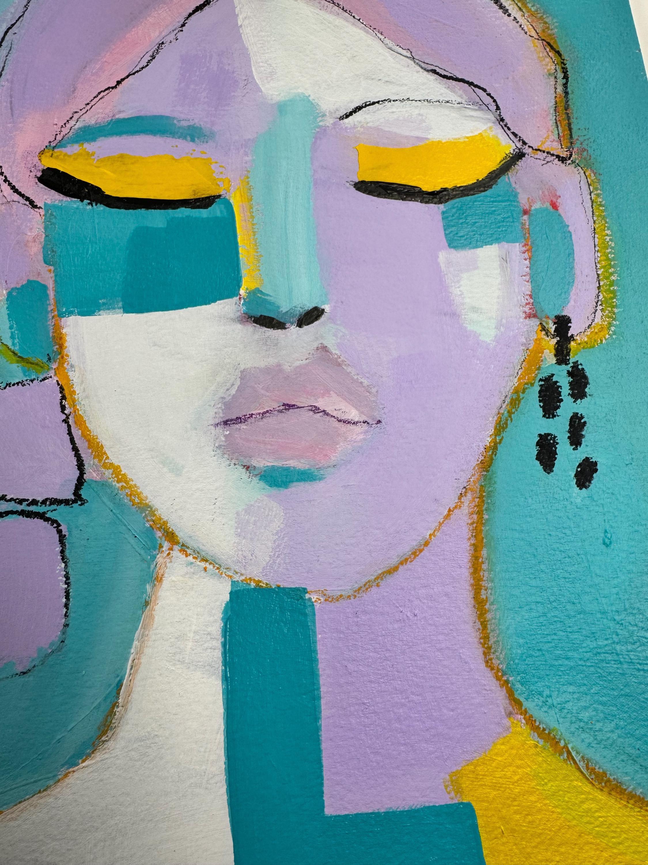 Soft lavender tones blend with turquoise, white, and vibrant golden yellow, creating a modern, expressive color palette. Loose sketch lines and layered paint give the piece movement and personality, while bold color blocking adds a contemporary edge.