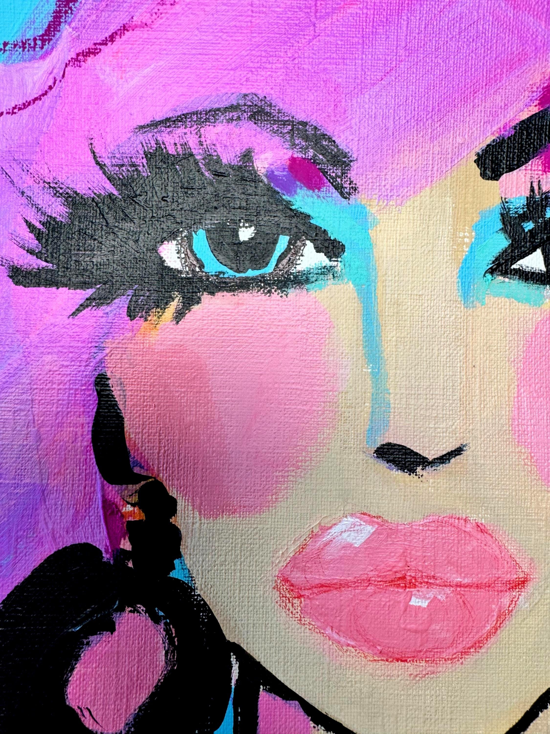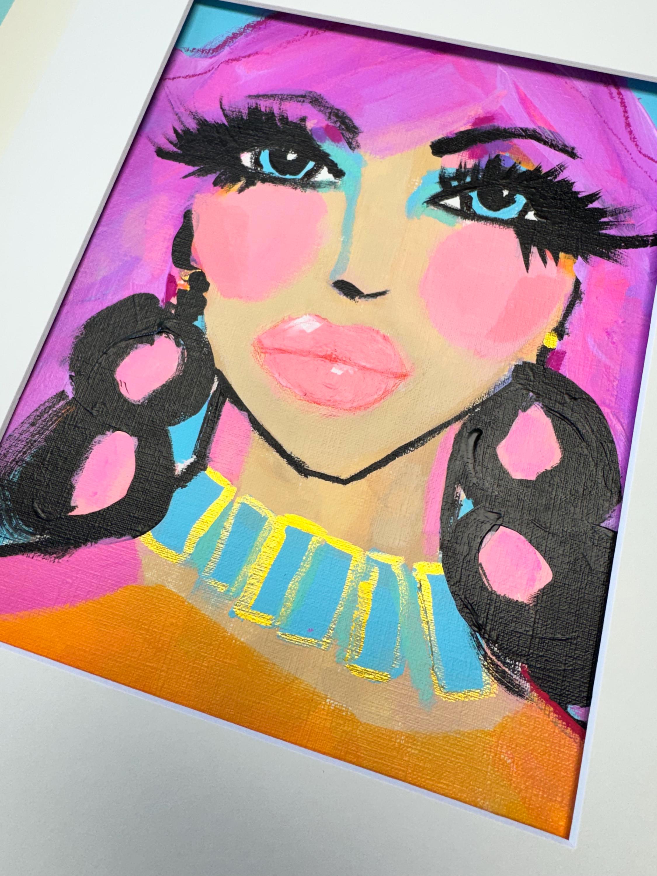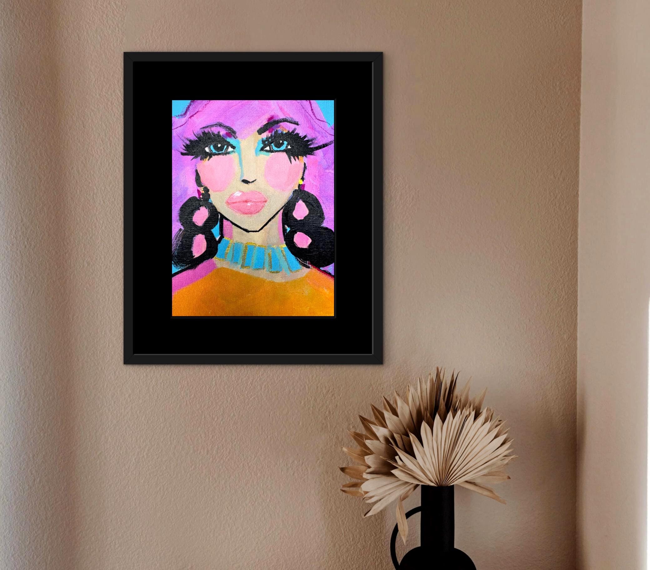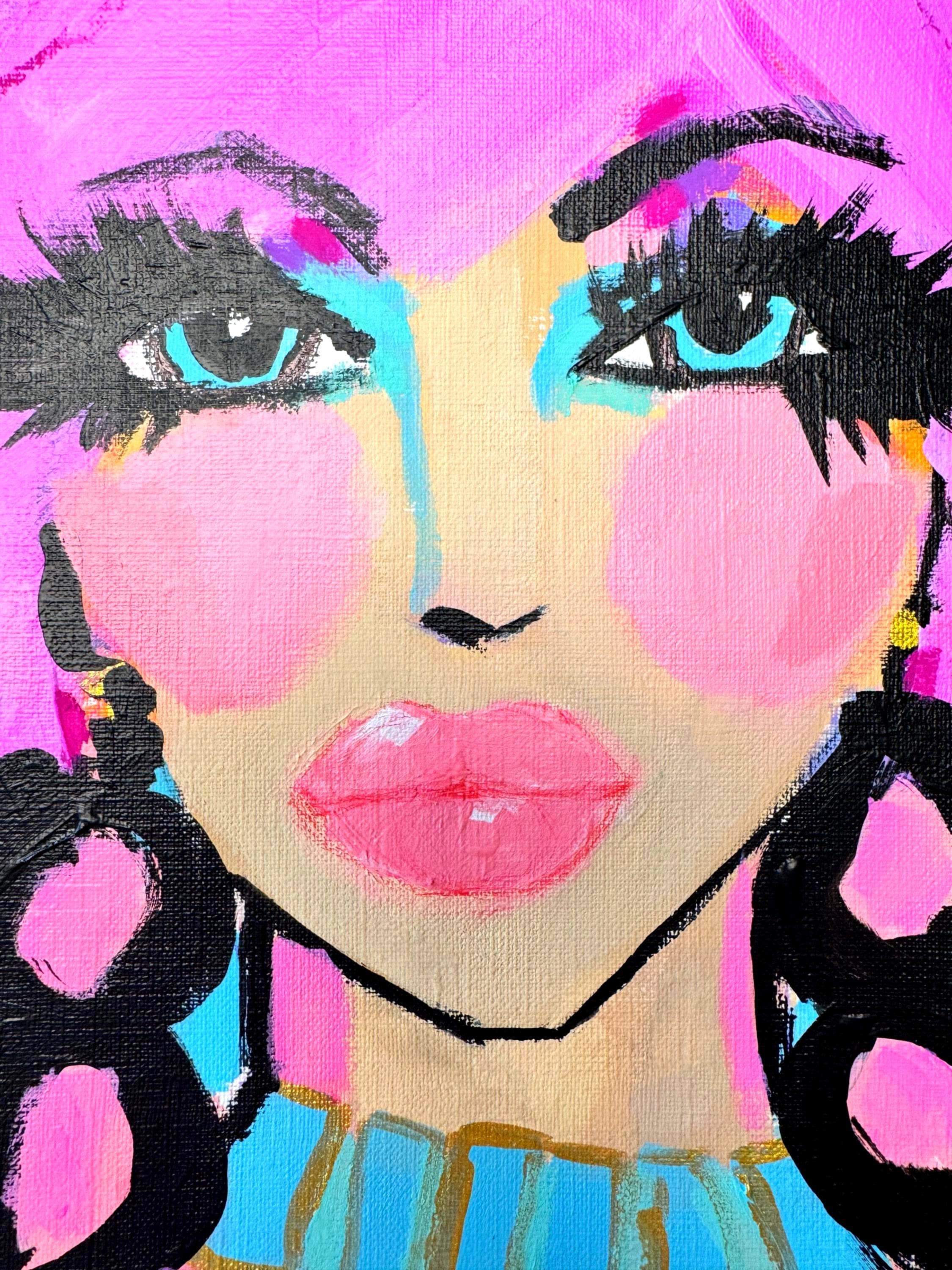 Meet Veronica, she’s bold and a little bit dangerous in all the right ways. This artwork is an original mixed media portrait that brings together high-gloss glam and expressive, raw brushwork. With striking blue eyes, electric pink hair, and oversized statement earrings, Veronica commands attention the second you see her.
