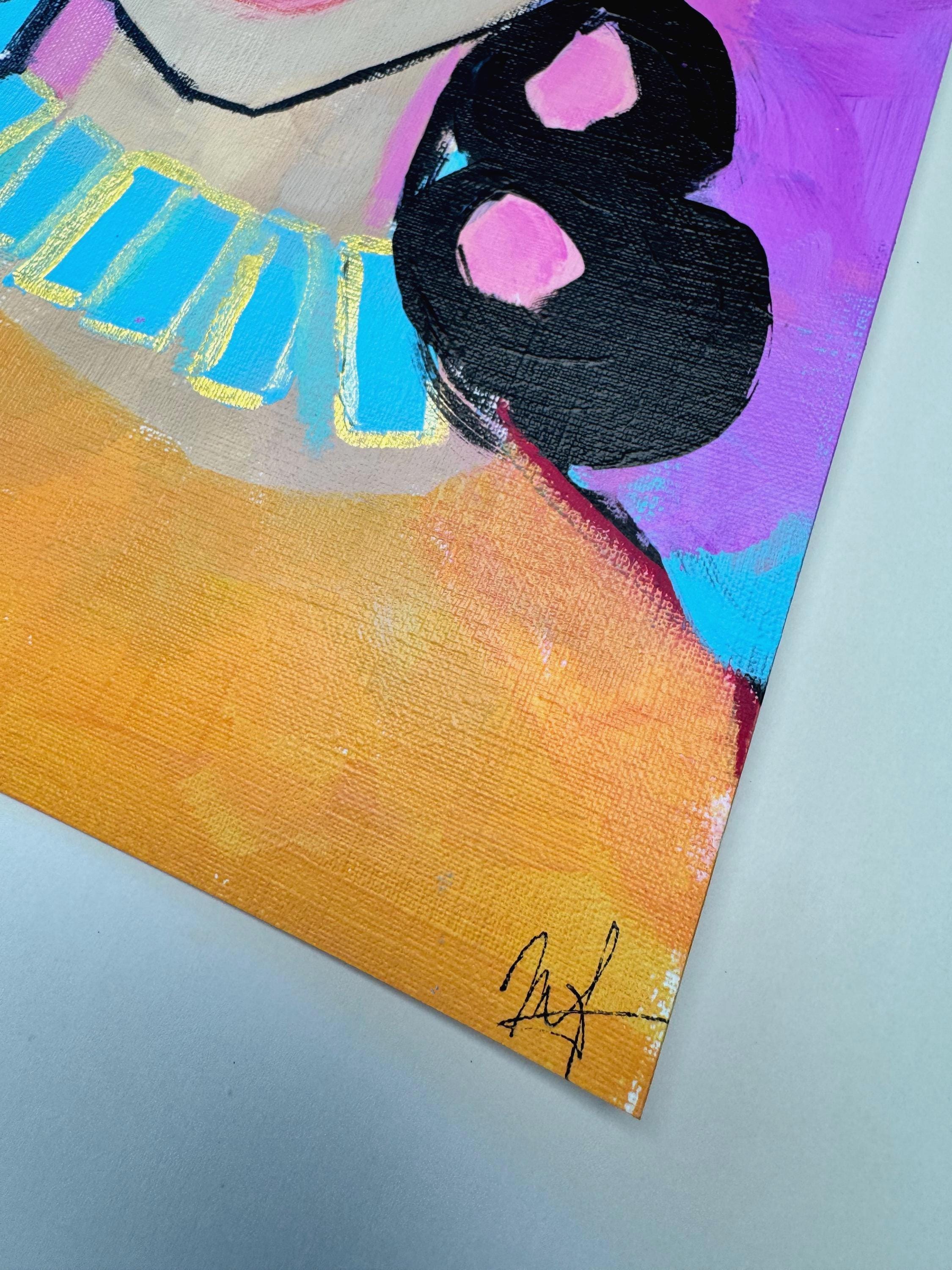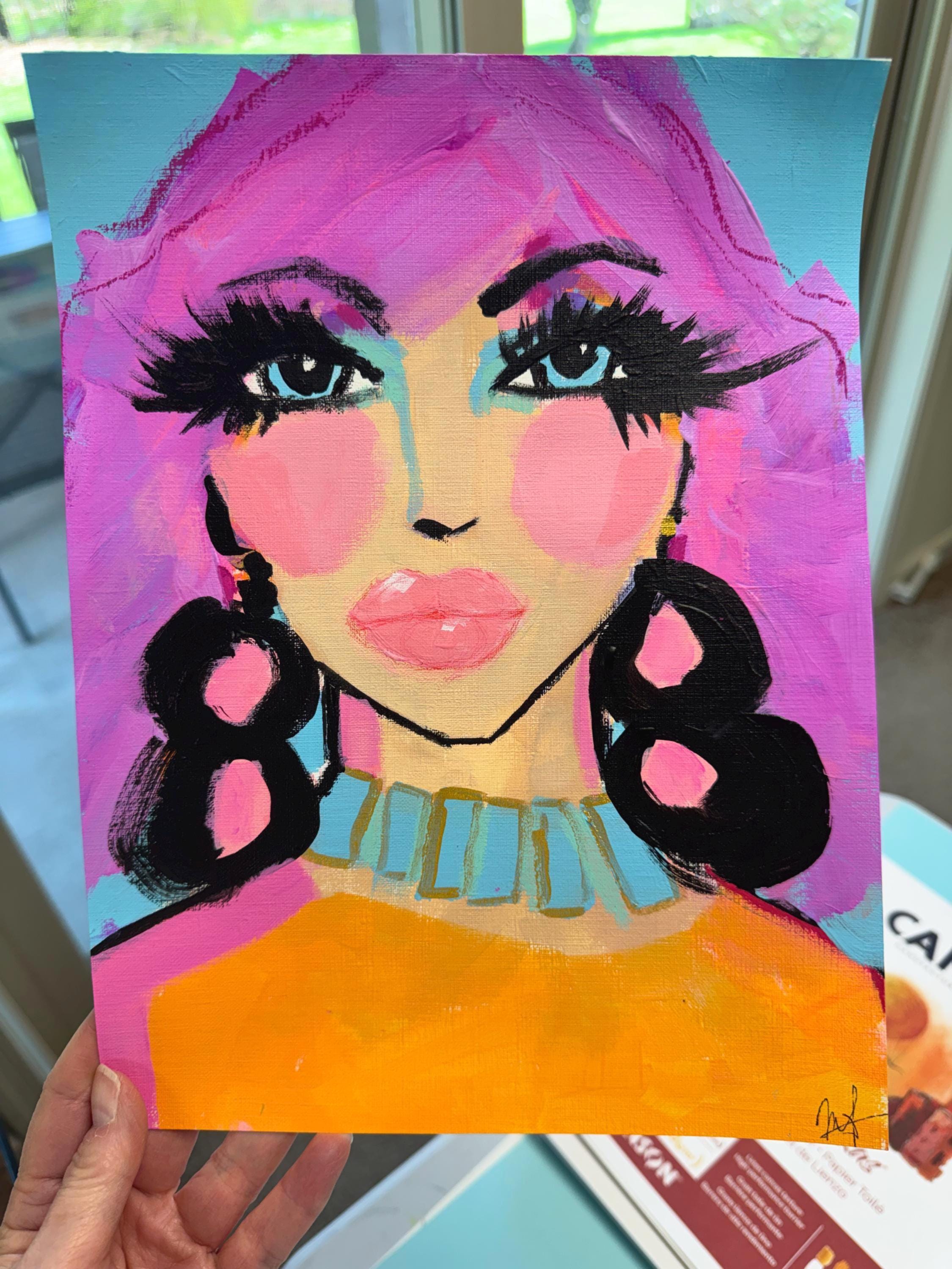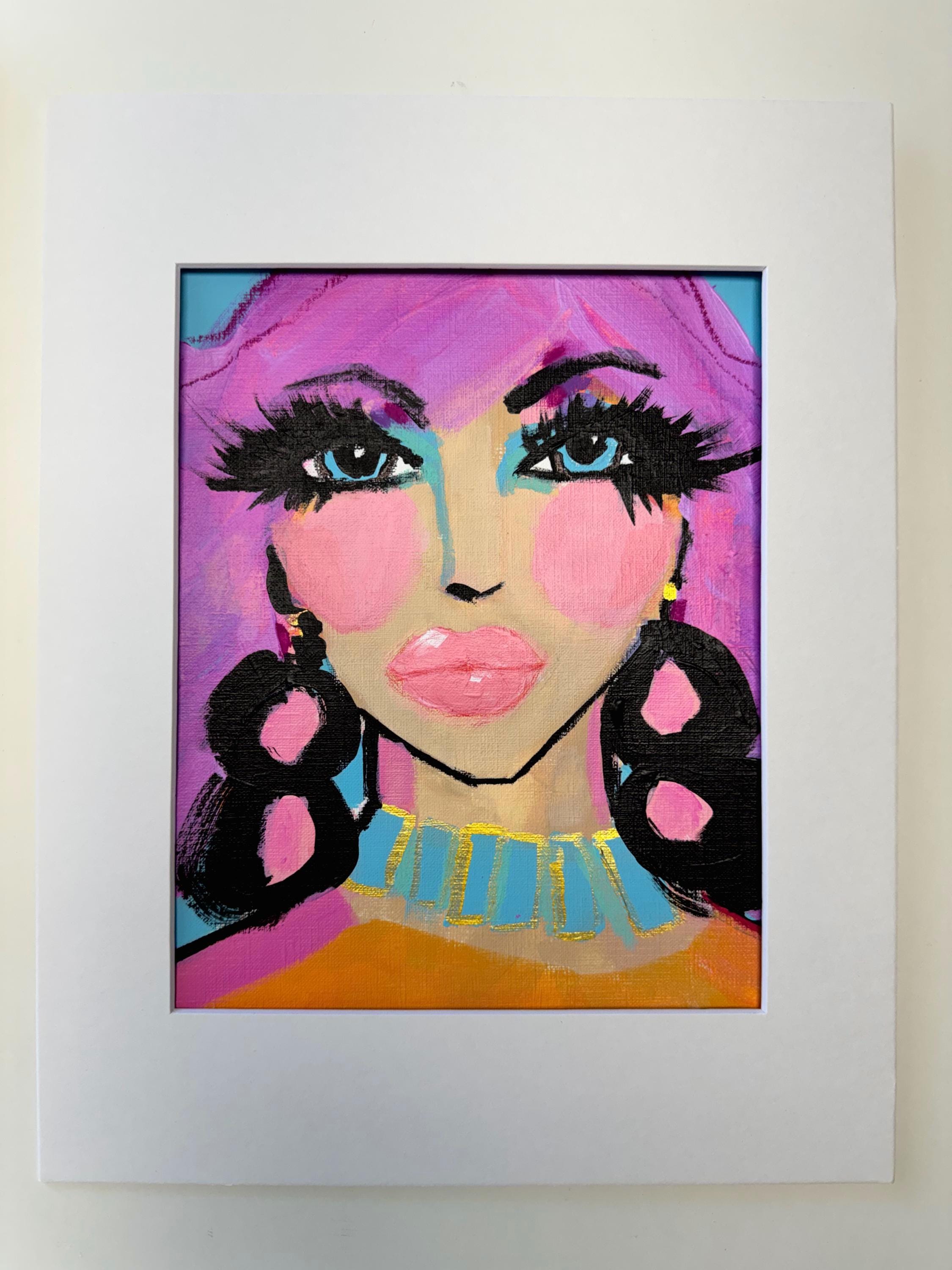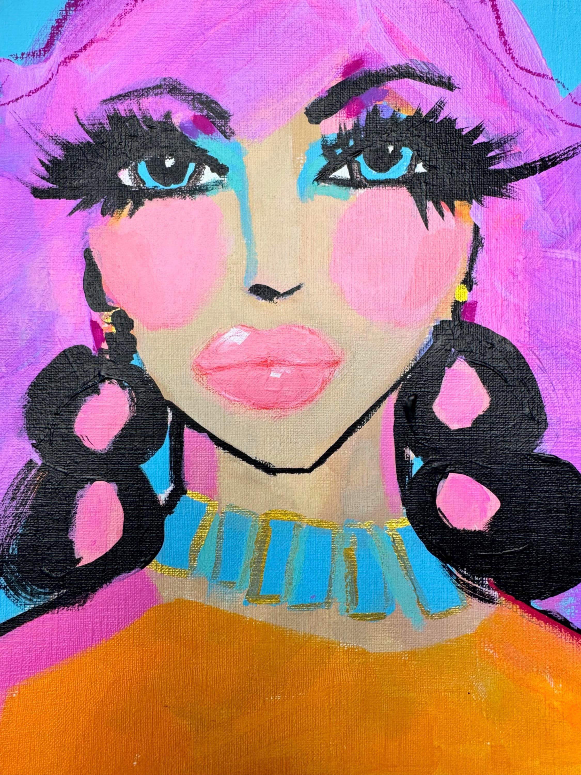 Meet Veronica, she’s bold and a little bit dangerous in all the right ways. This artwork is an original mixed media portrait that brings together high-gloss glam and expressive, raw brushwork. With striking blue eyes, electric pink hair, and oversized statement earrings, Veronica commands attention the second you see her.