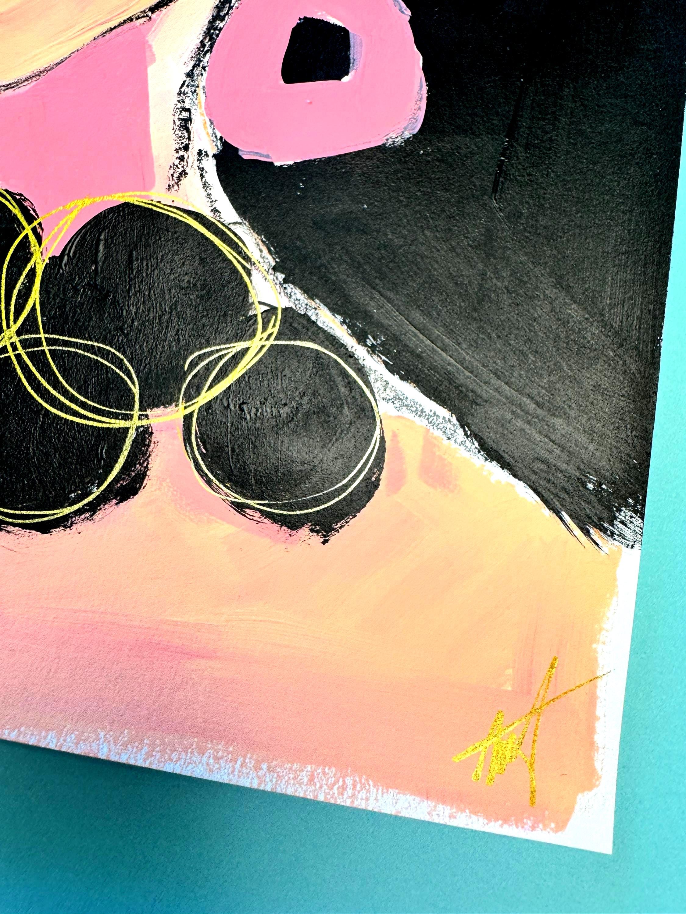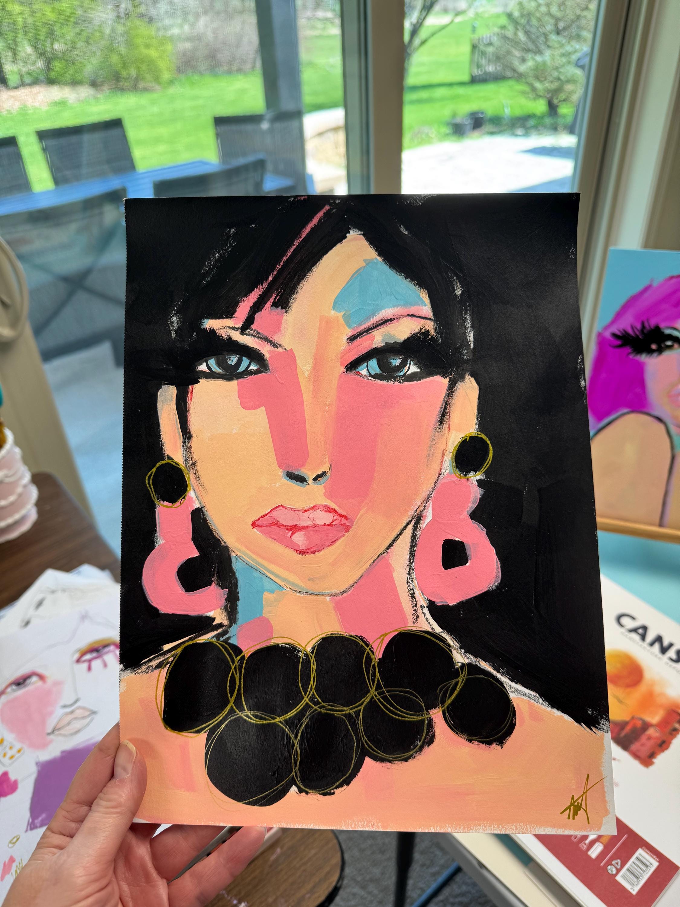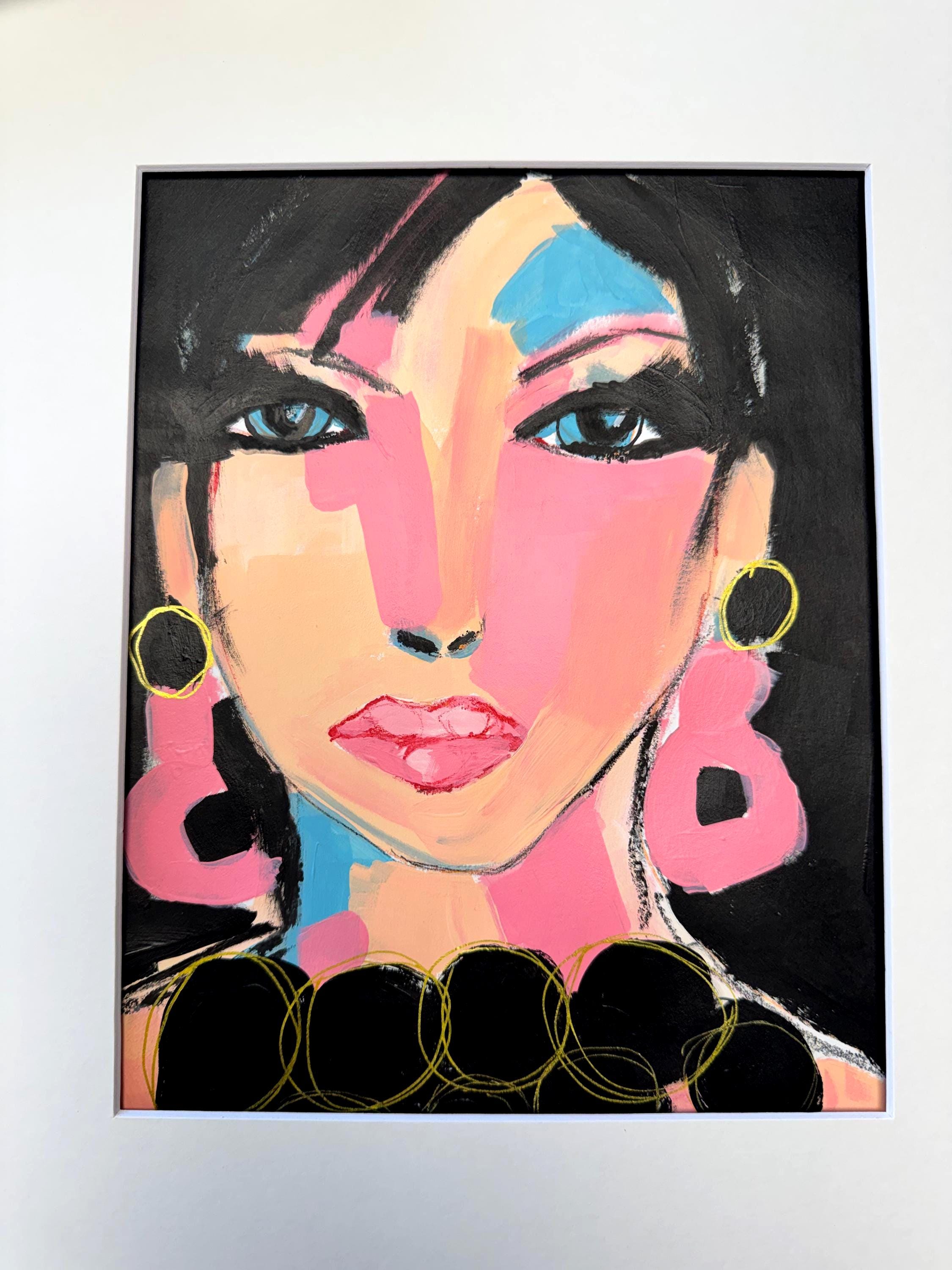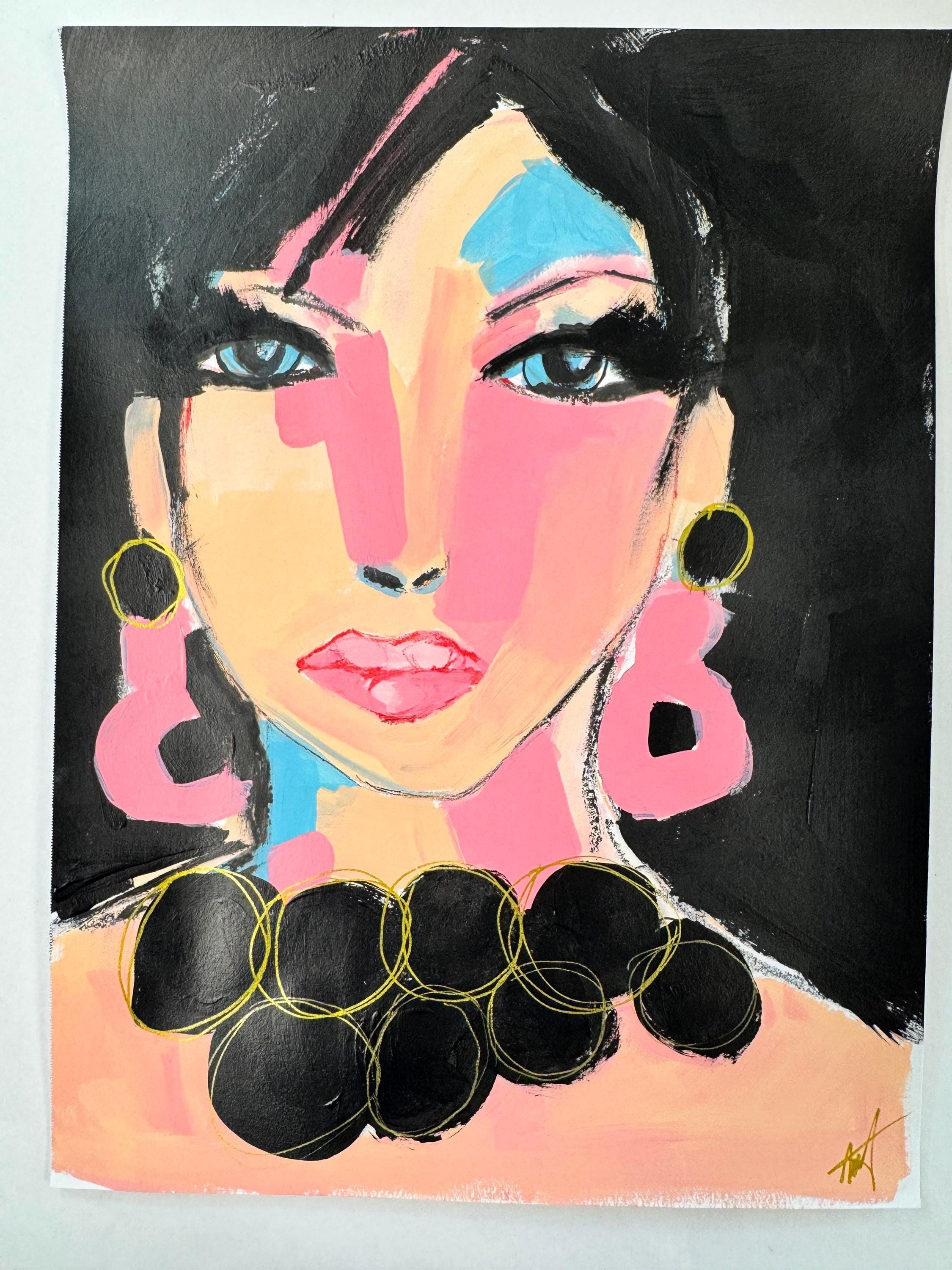 This original 9x12 mixed media portrait is all about bold femininity with an edge. Strong brushstrokes, layered textures, and a striking palette of blush pinks, jet black, and electric blue come together to create a modern, fashion-forward muse. Her oversized earrings and graphic necklace give her that “don’t mess with me” presence - equal parts glam and grit.