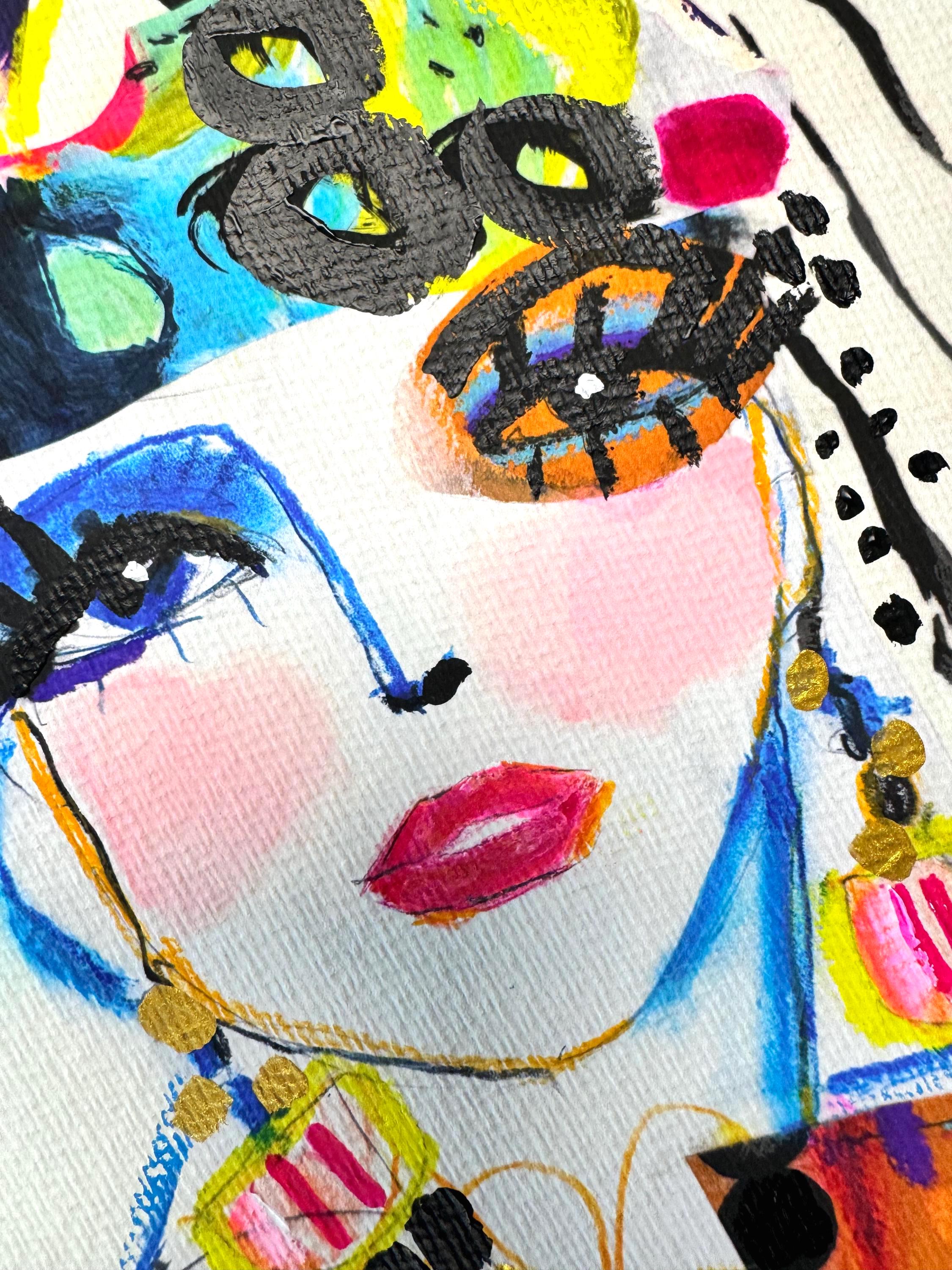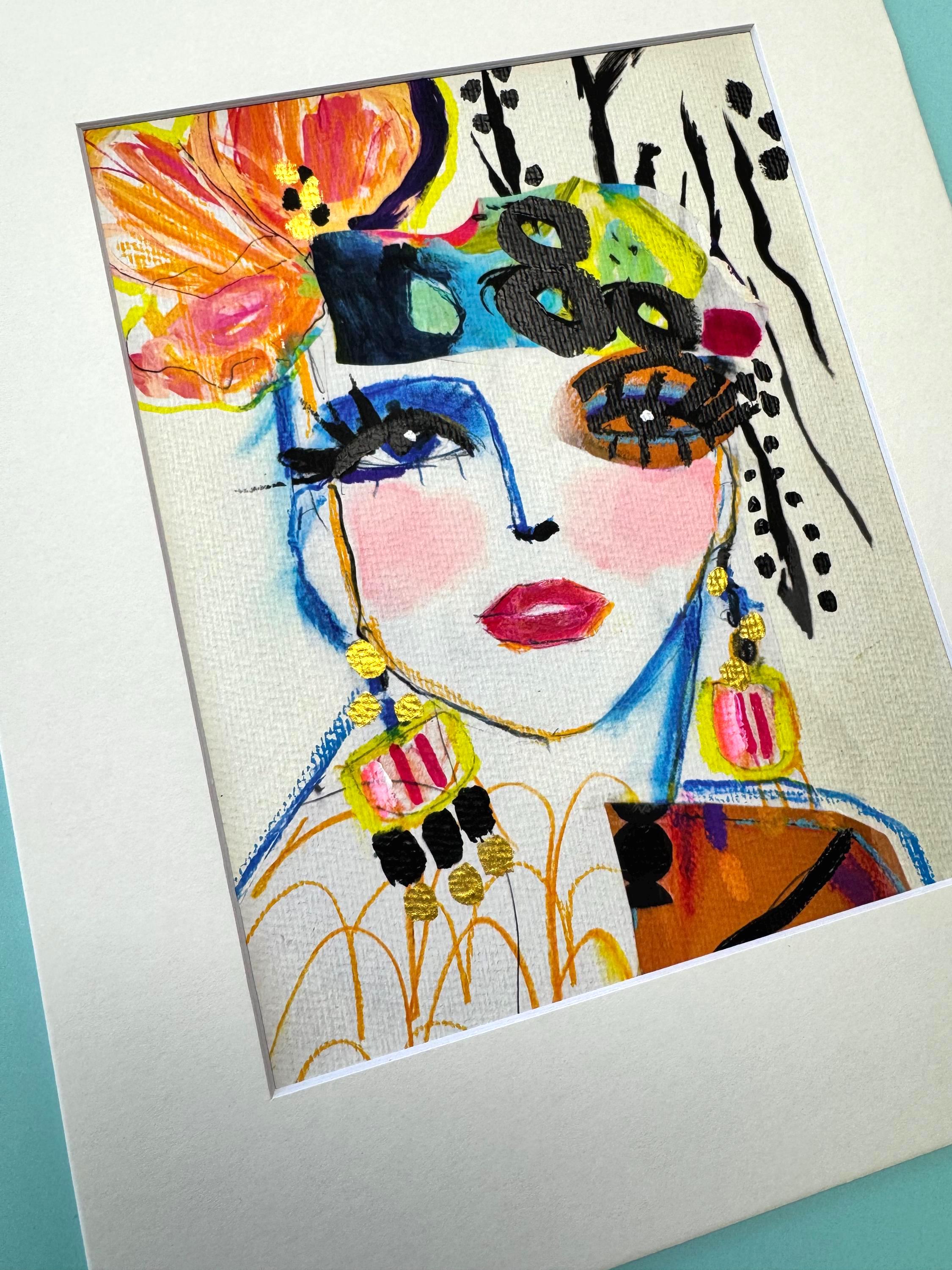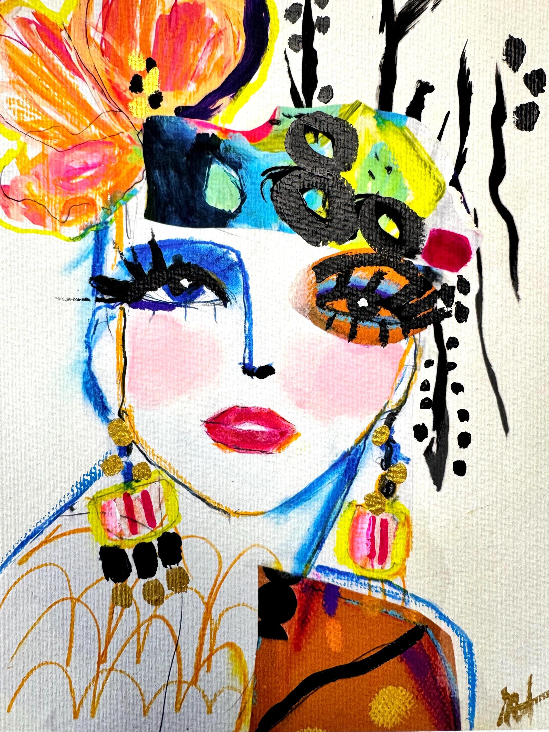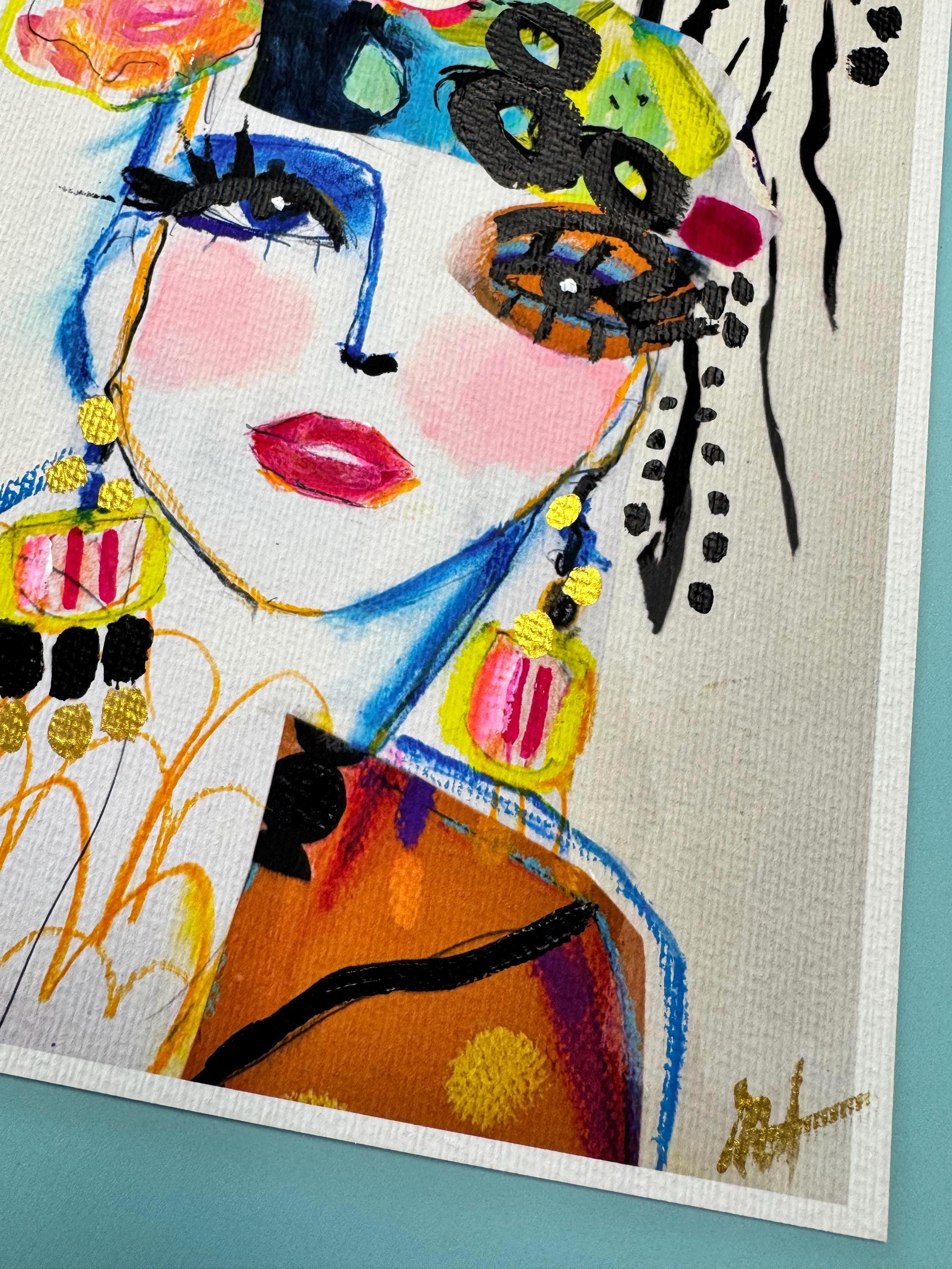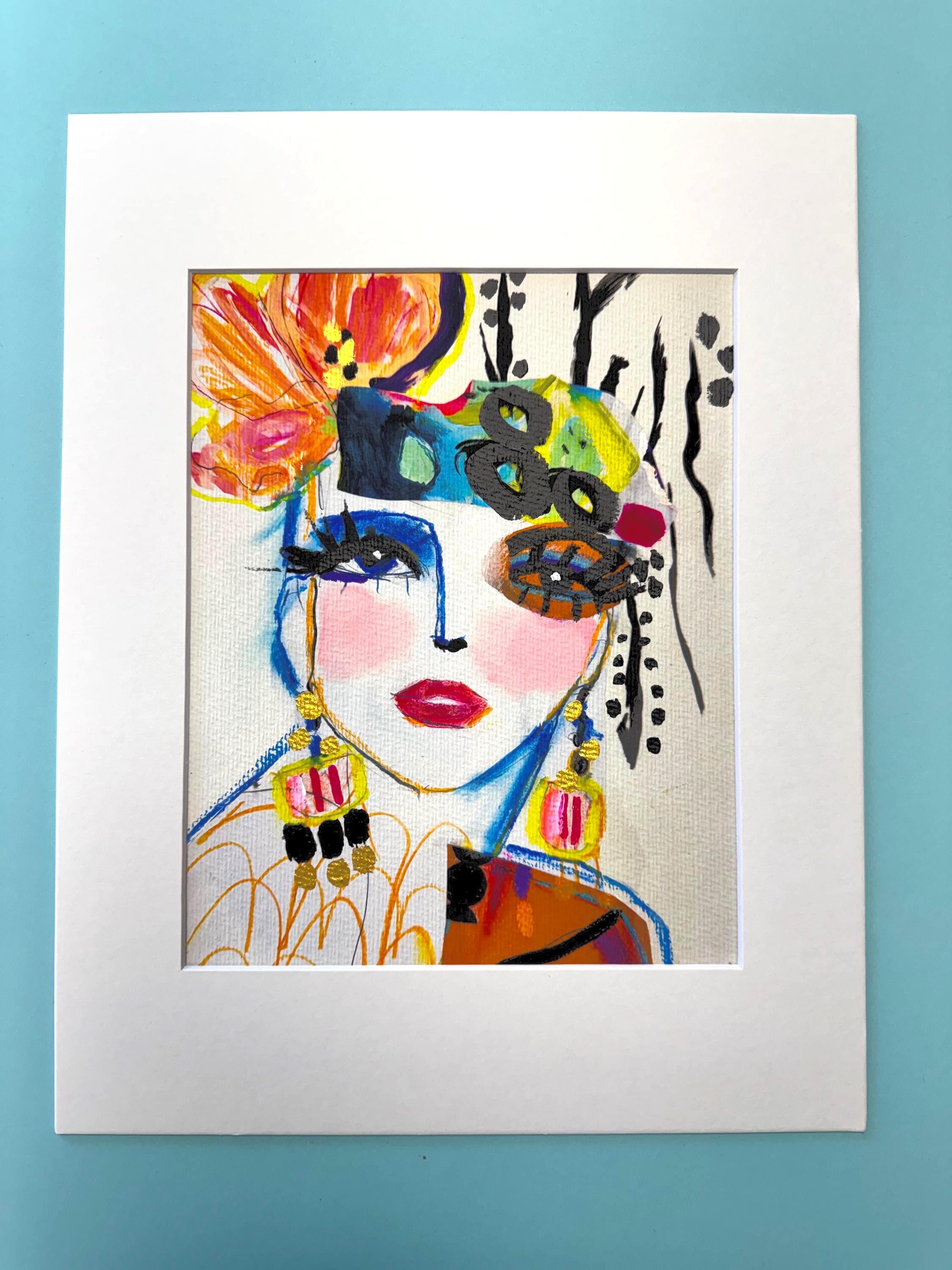 This piece began as an original mixed media painting, layered with spontaneous color and texture. Now transformed into a high-quality 8.5" x 11" print, it keeps that raw, hand-touched energy while making it easy to bring into your space. Original artwork was created by arranging hand painted collage pieces and bits of portrait sketchbook drawings.